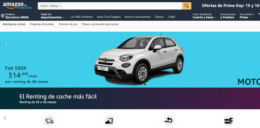 A través de amazon.es/motors se puede acceder a un vehículo mediante económicas cuotas mensuales, sin pago por reserva del vehículo, entrega gratuita a domicilio y una política de devolución de 30 días y 50 km. Los paquetes de renting están disponibles a 36 o 48 meses, e incluyen servicio y mantenimiento, seguro a terceros, sustitución de neumáticos, asistencia en carretera 24/7 y matriculación de vehículos.