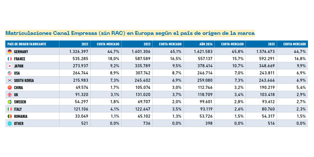 El análisis por país de origen de las marcas confirma que el mercado europeo de flotas sigue estando altamente concentrado, aunque con señales claras de cambio. Entre 2022 y 2025, las matriculaciones pasan de 2,97 millones de unidades a estabilizarse en torno a los 3,55 millones, lo que refuerza la idea de un canal corporativo sólido y predecible.