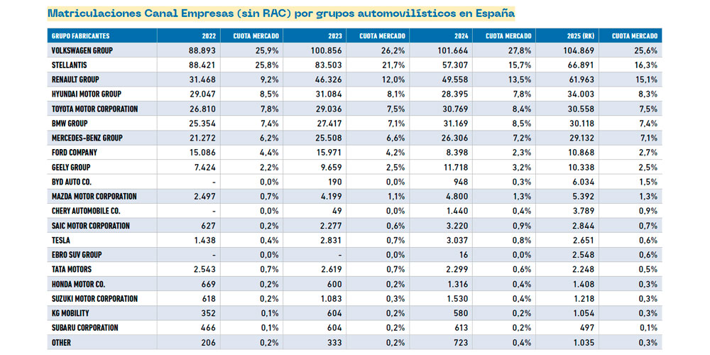 El análisis por grupos de fabricantes refuerza la idea de concentración del canal empresas en torno a los grandes actores europeos. Volkswagen Group se consolida como líder indiscutible, pasando de 770.593 unidades en 2022 a 977.193 en 2025. Stellantis ocupa la segunda posición, aunque tras alcanzar un máximo de 704.947 unidades en 2023, su volumen se reduce hasta 619.832 unidades en 2025. Renault Group mantiene un crecimiento sostenido y supera las 392.000 unidades.