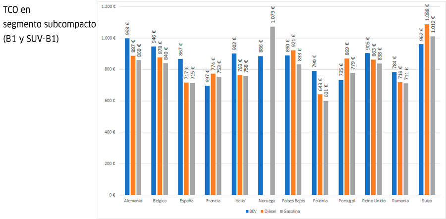 Si nos centramos en el mercado español y analizamos por motorizaciones, sobre la base de los segmentos que más volumen acumulan, vemos que el TCO más ventajoso, en el caso de los subcompactos (B1 – SUV B1), es para los modelos gasolina (715€) y diésel (717€) mientras que el TCO de los eléctricos asciende hasta los 867€.