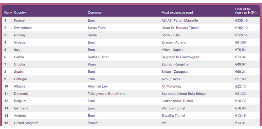 La autopista París-Marsella vuelve a encabezar el ranking con un coste medio para los vehículos pesados de 338,45€ (la cifra es correcta, no nos hemos equivocado). Le siguen el Gran túnel de San Bernardo (152,19€) y la autopista Bodø-Oslo (129,55 euros).