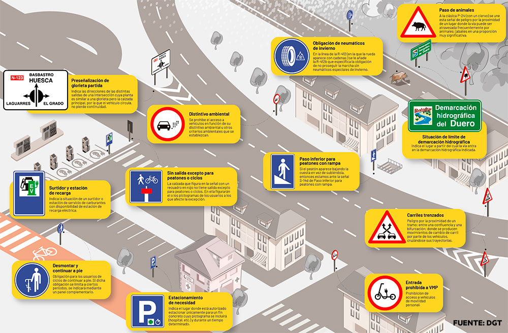 Además, se amplía y mejora la información relacionada con zonas de aparcamiento, estaciones de servicio (con señalización de nuevos tipos de combustible), carriles bici, pasos de peatones y entornos escolares. También se han introducido señales pensadas para mejorar la convivencia entre peatones, ciclistas y vehículos motorizados.