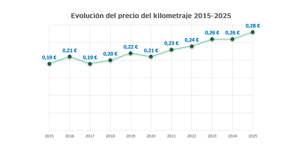 A partir de 2021, el crecimiento ha sido sostenido: 0,23 € en 2021, 0,24 € en 2022, 0,26 € en 2023 y 2024, hasta alcanzar 0,28 € en 2025. En una década, el incremento acumulado es de 0,09 euros por kilómetro, reflejo de la inflación y del encarecimiento de la movilidad corporativa.