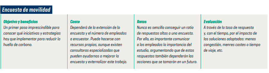 En este sentido, y como hemos dicho, el primer paso es realizar una encuesta sobre los hábitos de movilidad: cómo llegan a la empresa, cuánto tiempo emplean en sus desplazamientos al trabajo, qué modos de transporte utilizan, expectativas y preferencias de movilidad, qué opciones estarían dispuestos a adoptar, qué les gustaría que hiciera la empresa en materia de movilidad y cuál es su nivel de compromiso con la sostenibilidad de su movilidad.