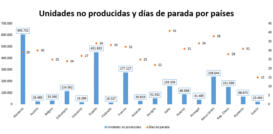 Alemania encabeza el ranking de los países que más vehículos han dejado de fabricar, superando las 600.000 unidades. Le sigue España con más de 450.000 unidades no ensambladas, Francia (277.000), Reino Unido (238.000) e Italia (159.000).