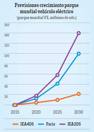 Son muchos los países y entidades que han establecido objetivos de sostenibilidad y descensos importantes de la contaminación y los niveles de CO2. Por ejemplo, la iniciativa internacional Electric Vehicles Initiative (EVI) tiene como objetivo 20 millones de coches eléctricos en 2020. Por su parte, la Declaración de París de Naciones Unidas sobre cambio climático ha marcado como hito recomendable un despliegue mundial de 100 millones de coches eléctricos y 400 millones de vehículos eléctricos de 2 y 3 ruedas en 2030.La Agencia Internacional de la Energía (IEA) se plantea 2 escenarios. El primero (IEA 2DS) establece como necesario un parque mundial de 150 millones de coches eléctricos en 2030 para no aumentar la temperatura global del planeta más de 2ºC. El segundo escenario (IEA 4DS), que implicará un aumento medio de 4ºC de la temperatura, apunta a un parque de 25 millones de coches eléctricos. Esta hipótesis quizás es más realista, pero más perjudicial para el planeta y los que vivimos en él.