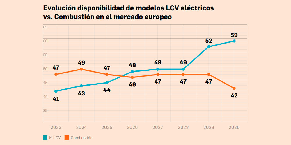 Es más, a partir de 2026, los compradores podrán elegir entre más modelos de furgonetas eléctricas europeas que con motor de combustión interna (48 frente a 46 modelos). Y en 2030 el número de LCV (Light Commercial Vehicle) eléctricos ya será de 59. Y ello sin contar los modelos no fabricados en nuestro continente.